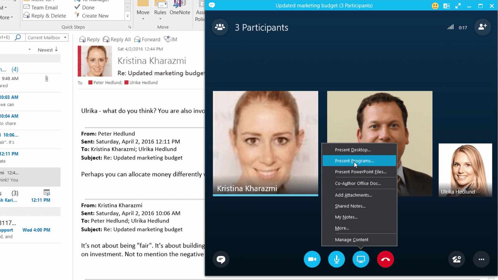 In this case I only want to share the Excel spreadsheet so I’ll select “Present Programs” and then I’ll select Excel with the marketing budget and click “Present”.