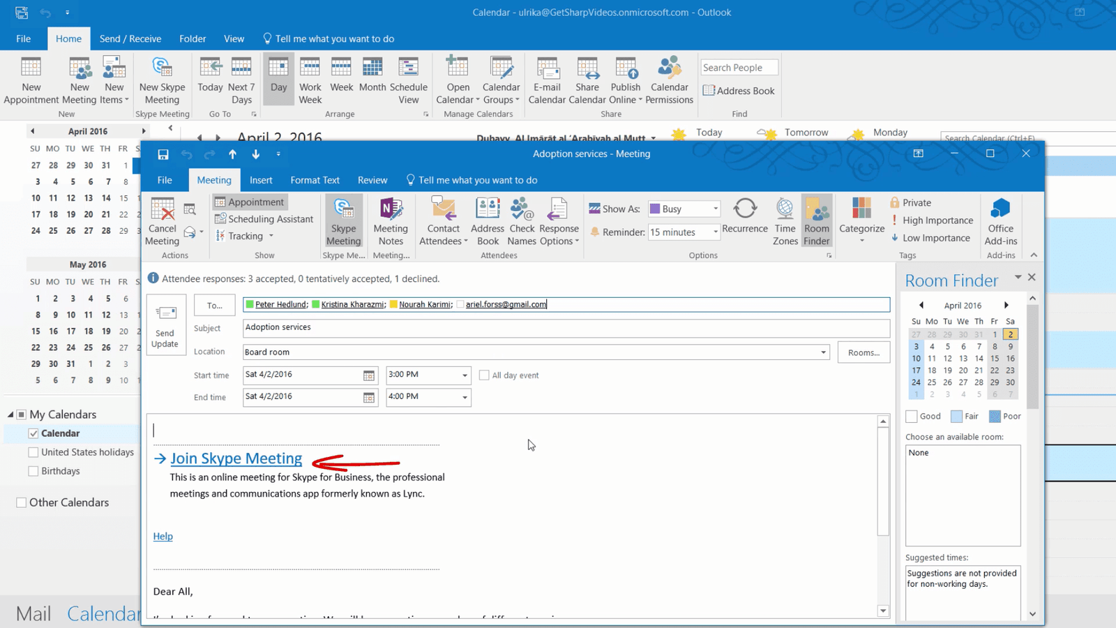 I open up my Outlook calendar. To set up an online Skype Meeting click “New Skype meeting”. In this case I already have an appointment for our meeting, so I’ll open it up and click “Skype meeting.” A link to join the meeting is automatically added to the meeting invitation.