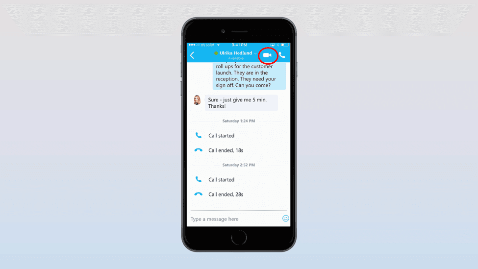 My assistant Leonisa is in another office packing equipment for a video shoot. She needs to ask me a question and since she has Skype for Business on her mobile she calls me from there. If your mobile phone is connected to the Wi-Fi network, you can make voice and video calls using Skype for Business free of charge.