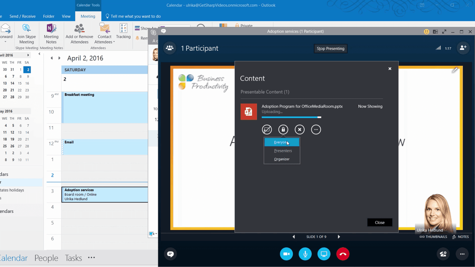 Later in the afternoon, a few minutes before the meeting with the customer starts I want to upload the presentation. To access the online meeting, you can open up the meeting invitation in Outlook, or you can open up Skype for Business and click the “Meetings” tab. Here you can find all your meetings.