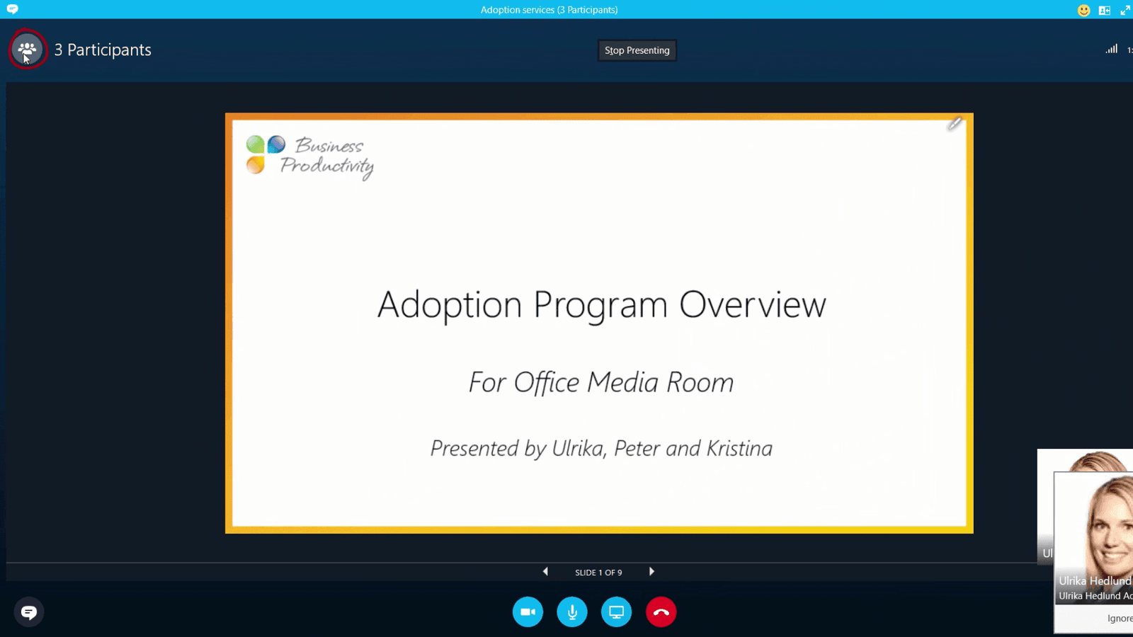 To stop the screen sharing click “Stop Presenting”. To go back to the meeting window click the little Skype for Business icon. To hang up click the red phone button. Even if you as a conference leader leave the meeting, everyone else can continue on the call. So you don’t have to worry about ending a meeting.