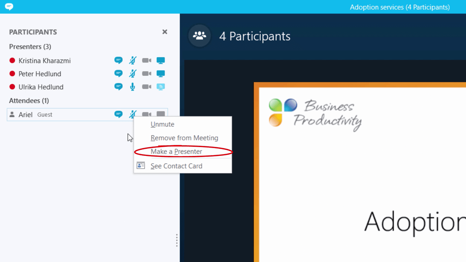 I can see that my colleagues who are my co-presenters have all joined. And there I can see that Ariel has joined as well. In the participant panel I can easily connect with all meeting participants. I can send individual instant messages, mute and unmute and also make others presenters.