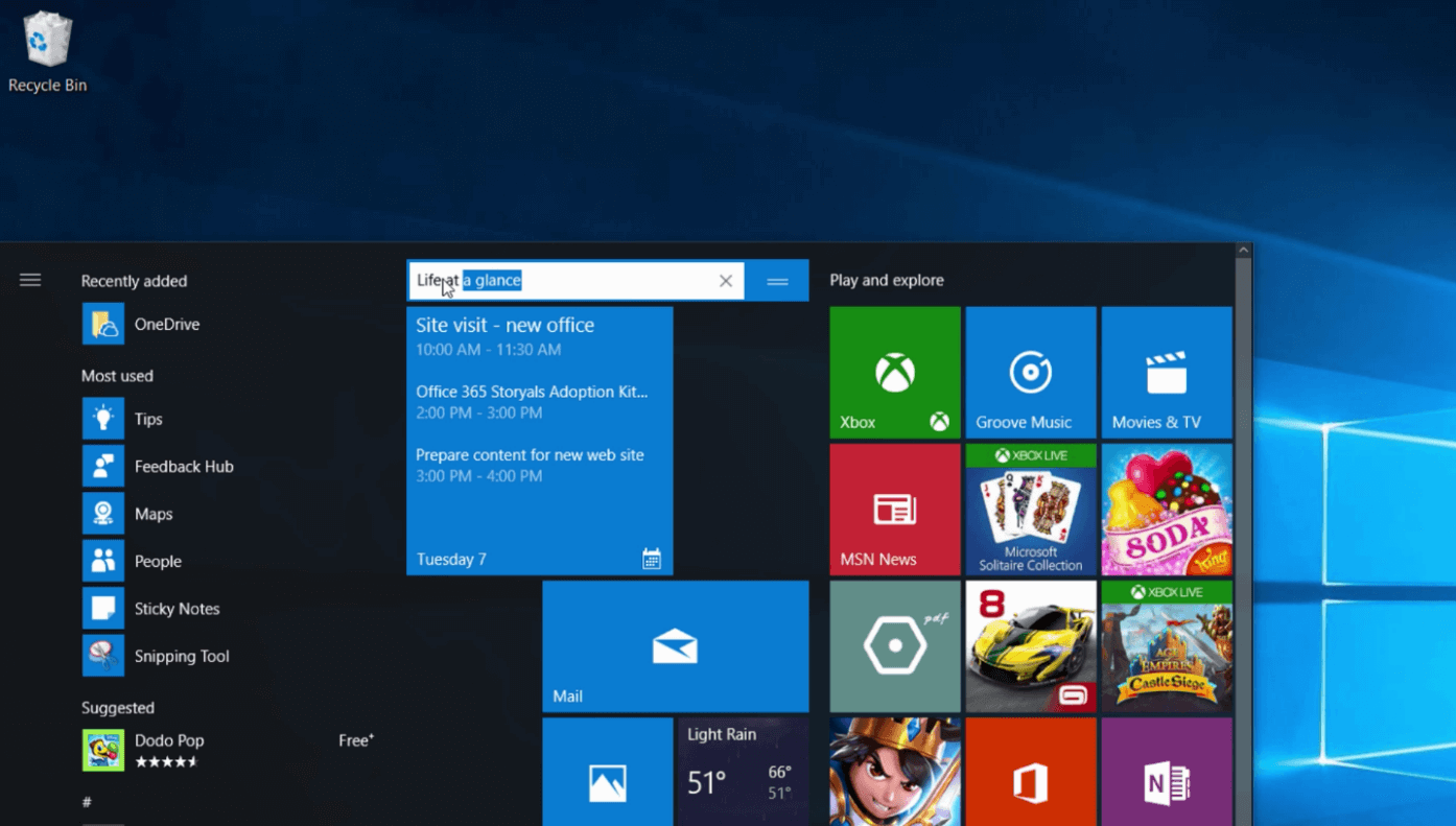 After having dropped off the kids, I open my laptop to get started with my work day. When I click the Windows Start button, I get a quick glance of what’s going on today. The live calendar tile shows me today’s appointments. Live tiles in Windows show you a preview of the information directly on the Start Page without you having to open the app. To enable the calendar app to show your work calendar, click the “Calendar” tile on the start page or search for it in the search box.