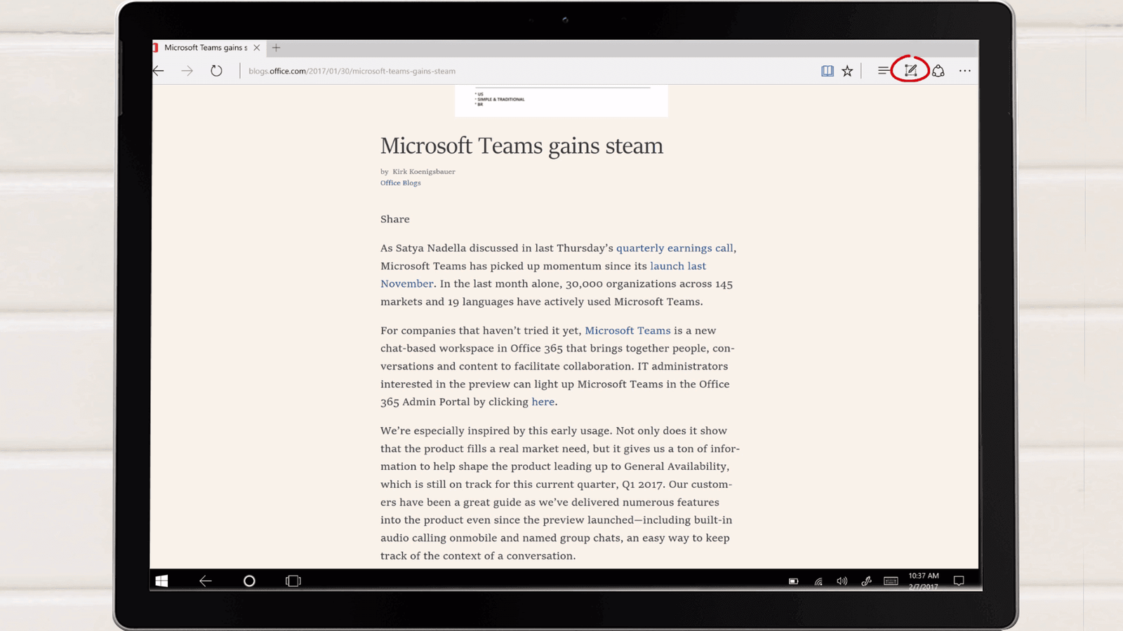 I’d like to take some notes in the article. To take notes in Edge, click the “Make a web note” icon, and then select pen and color.