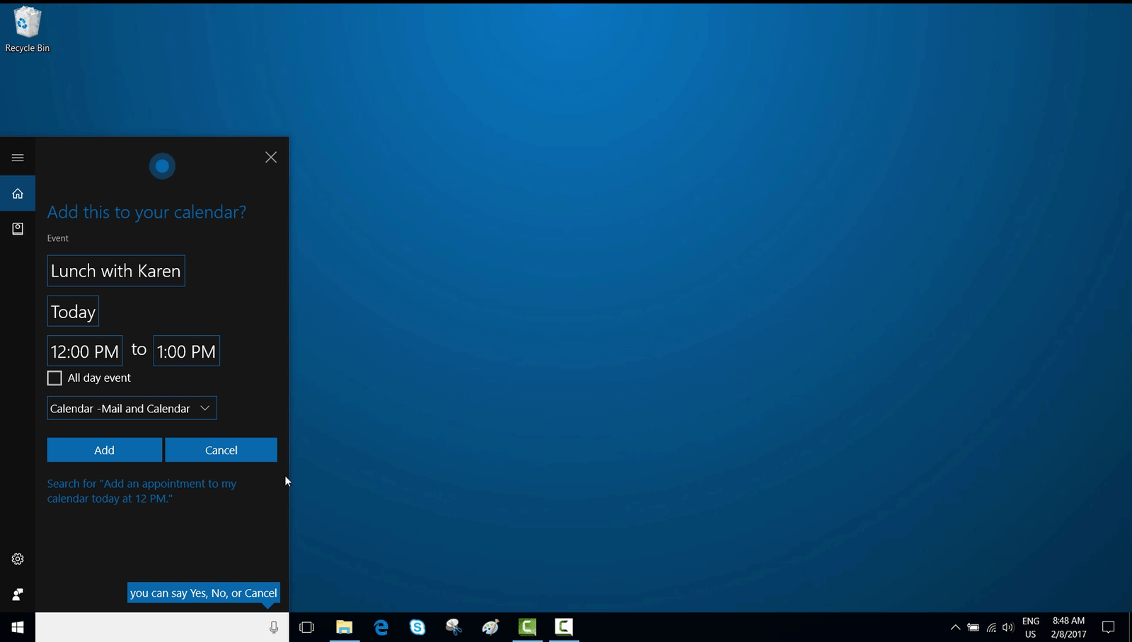 Cortana: – Alright, I’ll add Lunch with Karen to your calendar for today at 12 pm. Sound good?