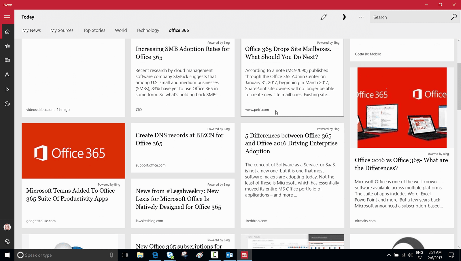 Before I get on with my work, I’ll open up the Windows News app to catch up on some technology-related news. I’ll click the “Technology tab” to see the top news from around the world, and then focus in on my one of interest areas which is Office 365.