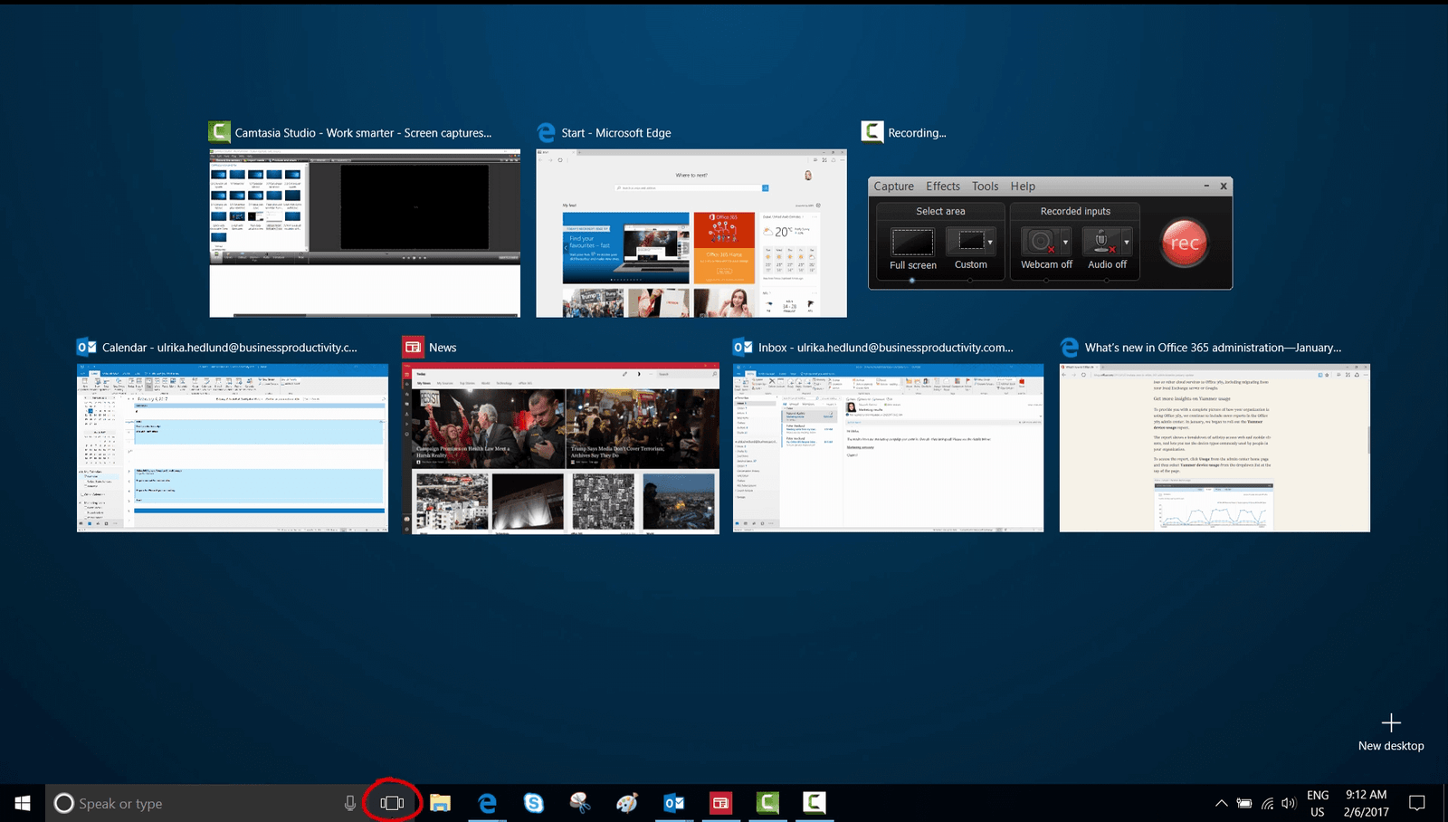 Now I’ll go to Outlook to have a closer look at today’s calendar. I can see that Cortana has added the lunch appointment. Next, I’ll have a quick look at my inbox before I continue with the video transcript I started working on yesterday. Instead of opening and minimizing applications I can easily switch between various task views, or so called “Virual desktops” in Windows 10. This way, I save time by quickly getting back to what I was working on. To set up virtual desktops, click the “Task view” icon on the task bar.