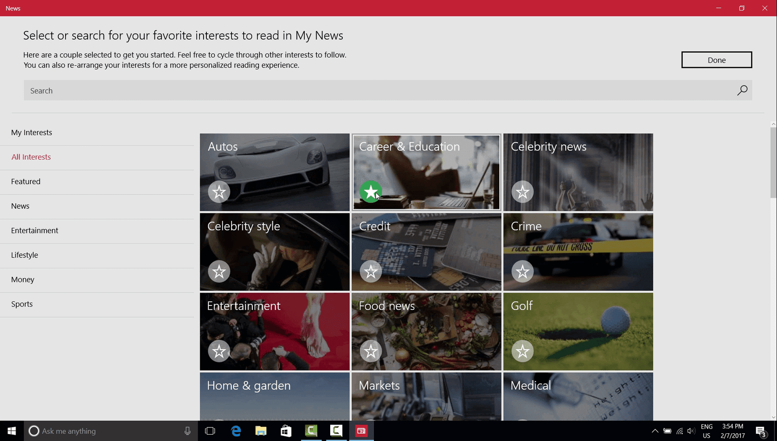 If you haven’t started using the news app, and you don’t see it under your start screen, you can just search for it. The first time you open it, you’ll be asked to select edition. Even though I’m based in Dubai, I’ve selected the US version, since it provides more options. You’ll also be asked to log in with a Microsoft account. To customize the news displayed, click “All interest” and then select various topics by clicking the star.