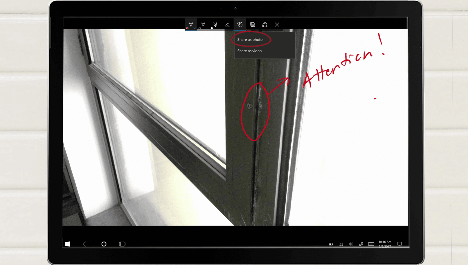 You can take handwritten notes and drawings directly on images in the Photos app. To add handwriting tap the “Draw” icon and select your preferred pen and color. Here I’ll mark the areas that need attention and then click “Share” to send the picture with my notes in an email to the contractor.