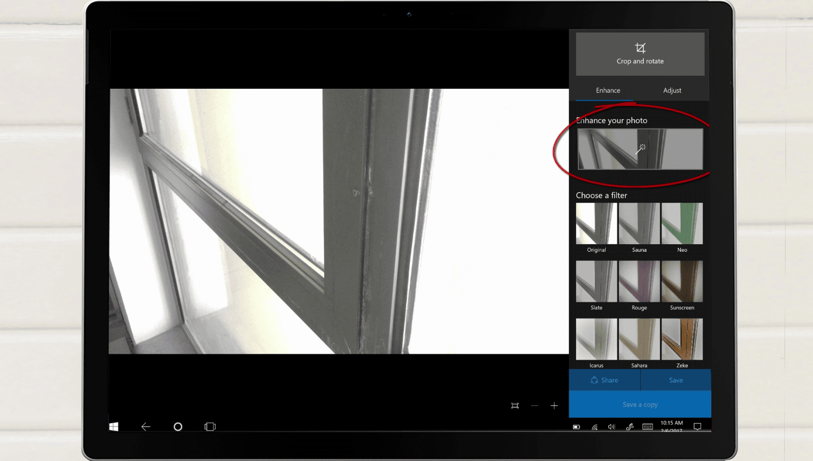 To switch direction of the camera I’ll press the rotate camera button and then take the picture. When I tap the picture it opens up in in the Windows Photos app. The picture is a bit bright so I’ll use the built in enhancement tool to fix the image.