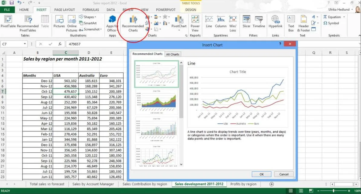 Using charts in Excel often intimidates people. Memories from high school pop up in your head and you break a sweat remembering you math-teacher scolding you because you got the Y-axis and X-axis mixed up. Or you’re worried that the Excel-guru in your team will see your report and smile mischievously because the chart type you chose doesn’t properly represent the data. With Excel 2013 you can feel at ease inserting charts in your report. Excel 2013 will analyze your data and recommend chart types that are best suited for the data set you have. You can then select one of the recommended charts and insert it into your spreadsheet.
