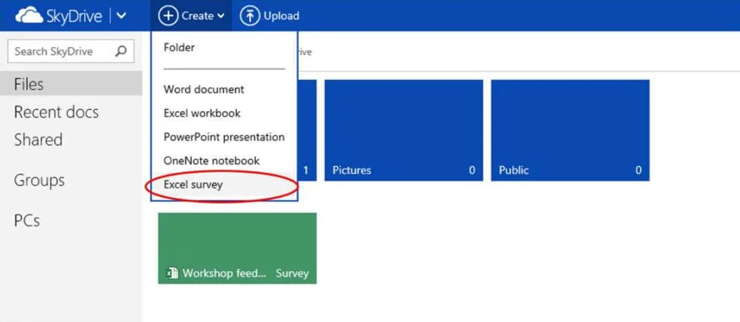 Quite frequently you need to gather feedback from people on certain topics. You might want feedback from customers after attending an event you’ve hosted, you might need input from your business partners on proposed business initiatives or you want recommendations from your team members on a restaurant for your off-site. There are lots of ways in which you can collect data, you can use a SharePoint survey, you can use option buttons in an Outlook email or you can use an external service like SurveyMonkey. There are pros and cons to all these options, but there definitely is room for an easy way to do this using Excel. Now, you can easily create a survey that is accessible to anyone over the Internet using Microsoft Excel 2013 and SkyDrive (at the time of writing this blog this functionality has not been rolled out to all SkyDrive users yet). You just go to SkyDrive and click “Create – Excel Survey”.